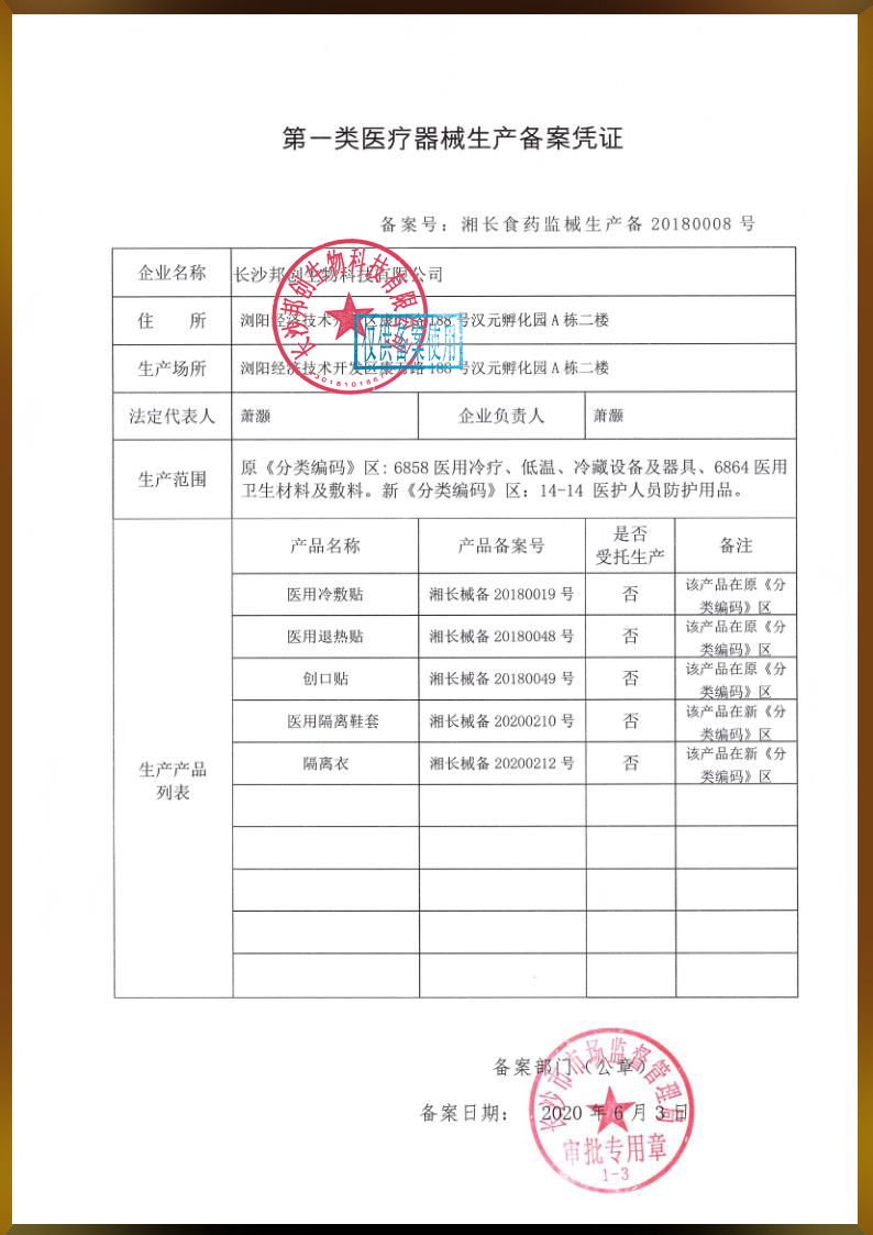 第一類醫(yī)療器械生產備案憑證